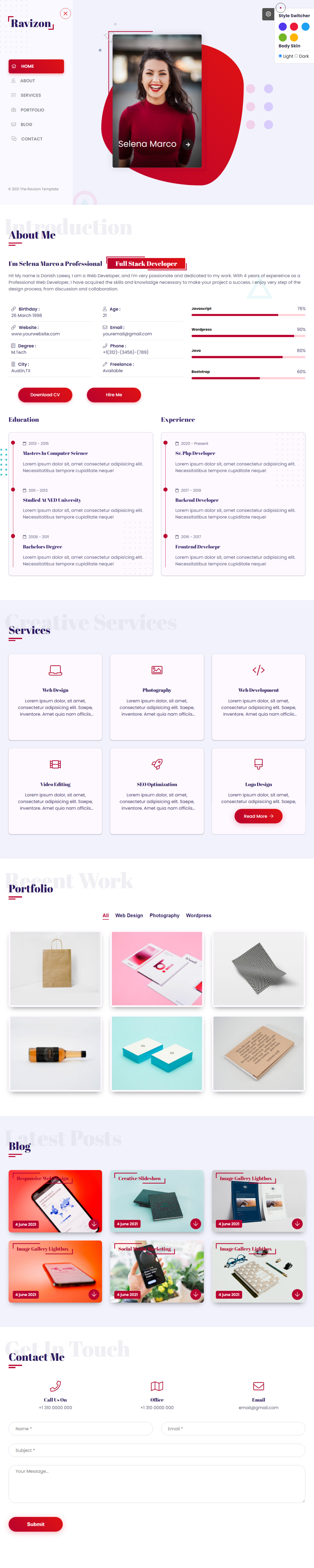 Ravizon – Personal Portfolio HTML Template is for many purposes like minimal portfolios, agencies, personal portfolios, photography, freelancer portfolios, etc. Users will love Your site because it gives them a unique user experience (UX). HTML files are well organized and named accordingly so it's very easy to change any and all of the design.